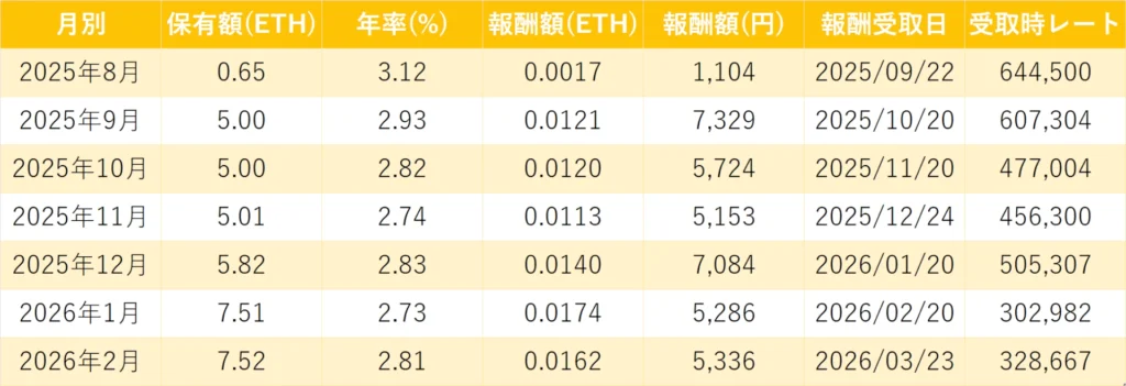 - 毎月20日にETHで報酬受け取り