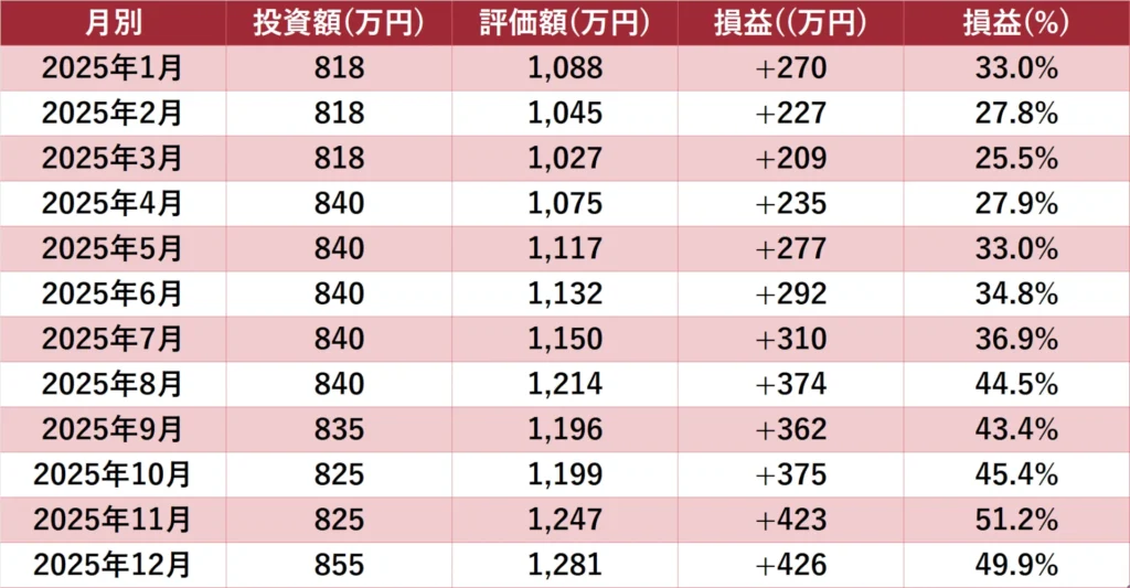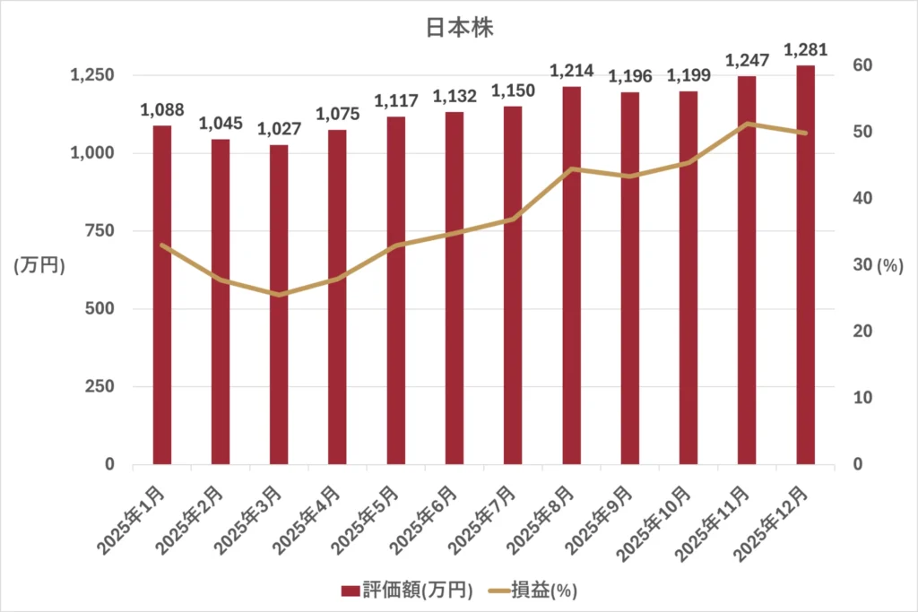 2025.12.31 日本株 【日本株】2025年12月 運用実績 ~高配当&優待銘柄を中心に~ okuno 日本株を特定口座で個別銘柄として保有している。 これは海外株投信に次いで資産割合が多くなっている。 本記事では、当月の運用成績、配当金、株主優待の内容を記録する。 あわせて読みたい【日本株】2025年 運用方針 運用成績 年始からの投資額と評価額の推移 評価額 : 1,281万円 損益率 : 49.9% 配当金 今月の配当合計額 : 42,682円 2025年の累計配当額 : 220,013円 今月の主な配当銘柄 9433 KDDI(240株) 7,650円 5401 日本製鉄(500株) 4,782円 8473 SBIホールディングス(200株) 3,188円 あわせて読みたい【日本株】2025年11月 運用実績 ~高配当&優待銘柄を中心に~ ABOUT ME オクノ無職生活を目指す投資家40代会社員。資産1億円を築き、無職生活への移行を目指している。 主に海外株投信と日本株を中心に長期運用を行い、FXによるスワップ収益や暗号資産のステーキングにも取り組んでいる。 本ブログでは、資産形成の記録と運用実績を公開している。